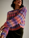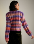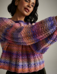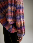 The Sunset Orchard Sweater has a flattering boxy shape which drapes gorgeously on the body. This knitting pattern features vertical columns of leaf patterned cables which contrast with horizontal bands of colourful Sirdar Jewelspun. A narrow, ribbed cuff gently pulls in the fabric to create slightly balloon shaped sleeves.